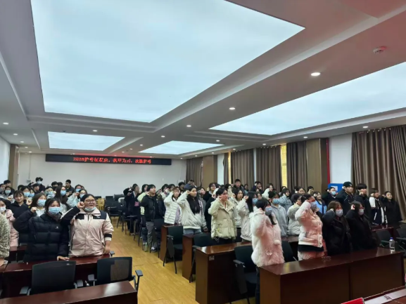 在领誓人的带领下,全体备考学子肃然起立,高举右拳,以青春的名义庄严宣誓,铿锵有力的誓言在报告厅内回荡,彰显了同学们破釜沉舟的决心和必胜的信念,将现场气氛推向高潮。