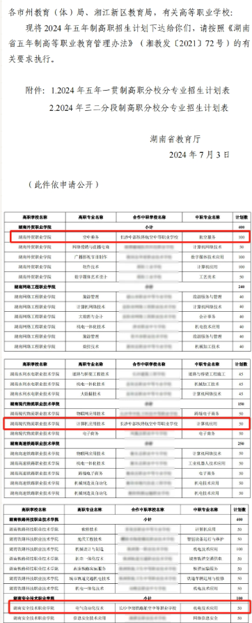2024年,长沙中部铁路航空中等职业学校获批与湖南外贸职业技术学院(公办)、湖南现代物流职业学院(公办)、湖南安全技术职业学院(公办)联合开办五年(3+2)制大专班,招生计划200人。其中,与湖南外贸职院合作空中乘务专业100人,湖南现代物流职业技术学院计算机应用技术专业50人,湖南安全技术职业学院电气自动化技术专业50人,三所学校发挥各方优势,共同培养专科层次高素质技能人才,圆初中学生大学梦!