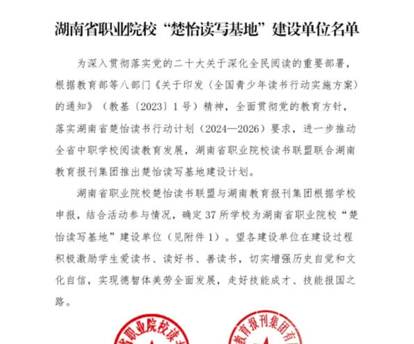 11月,我校入选由湖南省职业院校楚怡读书联盟与湖南教育报刊集团联合评选的37所湖南省职业院校“楚怡读写基地建设单位”之列。这一殊荣不仅标志着我校在职业教育领域取得了新的突破,更是对我们长期以来致力于提升学生综合素质、弘扬优秀传统文化、推动读写教育创新发展的高度肯定。