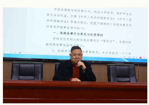 最后,桂校长严肃重申了关于严禁教师违规收费的纪律要求。他指出,违规收费不仅严重违反教师职业道德和国家相关规定,更损害教育形象,加重学生家庭负担。学校对此类行为始终坚持“零容忍”态度。他要求全体教师务必引以为戒,严格自律,规范从教行为,坚决杜绝任何形式的违规收费,共同维护风清气正的育人环境。