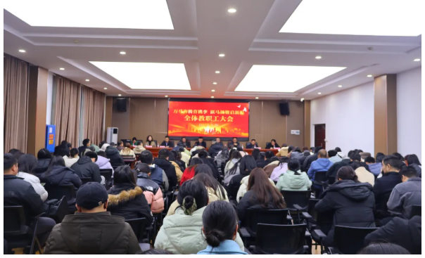 踏着丙午马年奔腾奋进的鼓点,3月2日,我校在多功能报告厅隆重召开2026年春季新学期全体教职工大会。本次大会既是回首往昔的总结会,更是展望未来的动员会,旨在凝聚全体教职工的智慧与力量,以“万马奔腾”的气势,开启新学期“跃马扬鞭”的新征程。