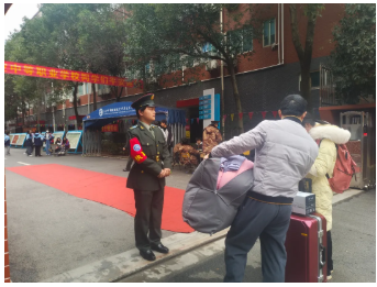 对入校学生及家长进行有序引导与身份核验。