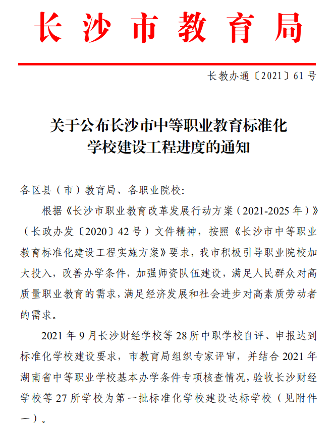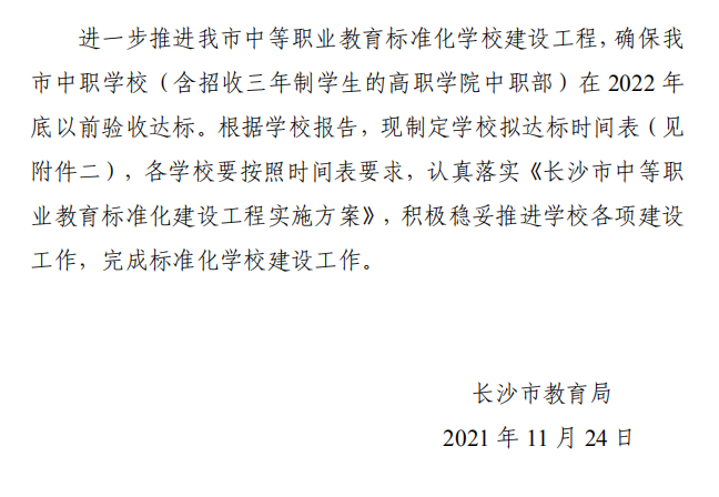 2021 年 9 月长沙市教育局组织专家评审,结合 2021年湖南省中等职业学校基本办学条件专项核查情况,对中职学校自评、申报达到标准化学校建设验收。长沙中部铁路航空中等职业学校等 27 所学校为第一批标准化学校建设达标学校。