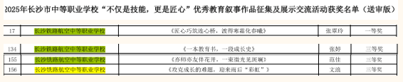 在刚刚落幕的2025年长沙市中等职业学校“不仅是技能,更是匠心”优秀教育叙事作品征集及展示交流活动中,我校教师的匠心之作在全市众多参赛作品中脱颖而出,揽获一、三等奖共计四项荣誉,展现了卓越的教育情怀与专业素养!