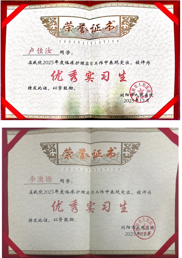 12月29日,在浏阳市人民医院2025年度实习生总结大会上,我校彭圣媛、卢佳汝、李澳塬三位同学三名学生从众多本科、大专院校实习生中脱颖而出,荣获“优秀实习生”称号。这份荣誉,不仅是对她们实习期间临床实践的最好总结,更是对我校护理教学成果的生动验证。