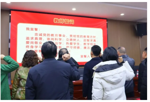 大会最后一项,举行全体教职工宣誓仪式。在学工校长胡春的领誓下,全体教职工高举右拳,庄严宣誓。一句句铿锵有力的誓词,表达了他们对教育事业的无限忠诚与热爱,展现了新学期昂扬向上的精神风貌。誓言声声,响彻会场,不仅是对自我的鞭策,更是对学生、对家长、对社会的一份沉甸甸的承诺。